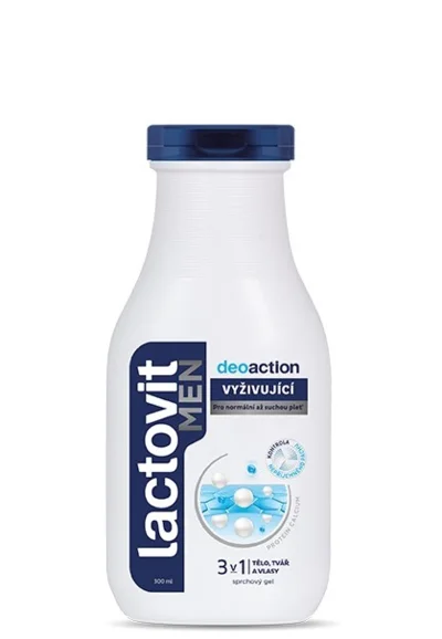 Čas i místo v koupelně vám ušetří Lactovit Pánský sprchový gel 3v1 Deoaction, který jemně myje vaše tělo, tvář i vlasy. Díky svému složení s Protein Calcium pokožku navíc intenzivně hydratuje a vyživuje, navíc má deodorační účinek pro příjemný pocit svěžesti a komfortu.
