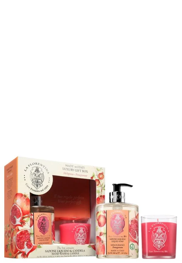 La Florentina Dárková sada Melograno obsahující jemné tekuté mýdlo založené na olivovém oleji a přírodních extraktech a vonnou svíčku s ovocnou vůní jistě udělá radost každé ženě.